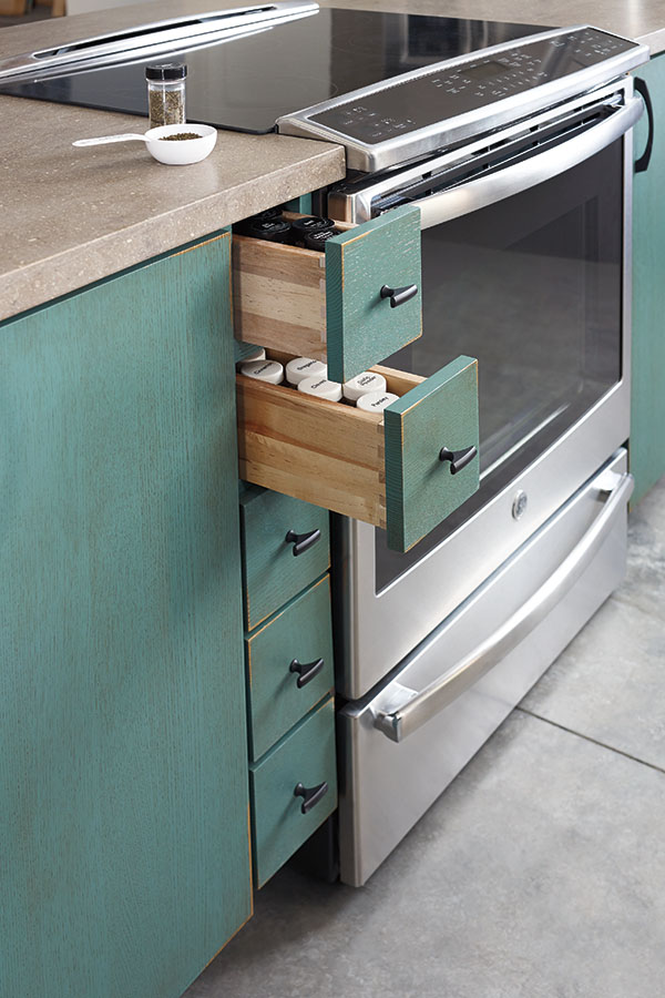 Industrial meets modern in this showstopper kitchen. The Monument perimeter cabinets provide a unique look with the semi-translucent finish, while the Antique Aquamarine island adds a pop of color. Plenty of storage options, including open storage, make this kitchen as functional as it is fashionable.