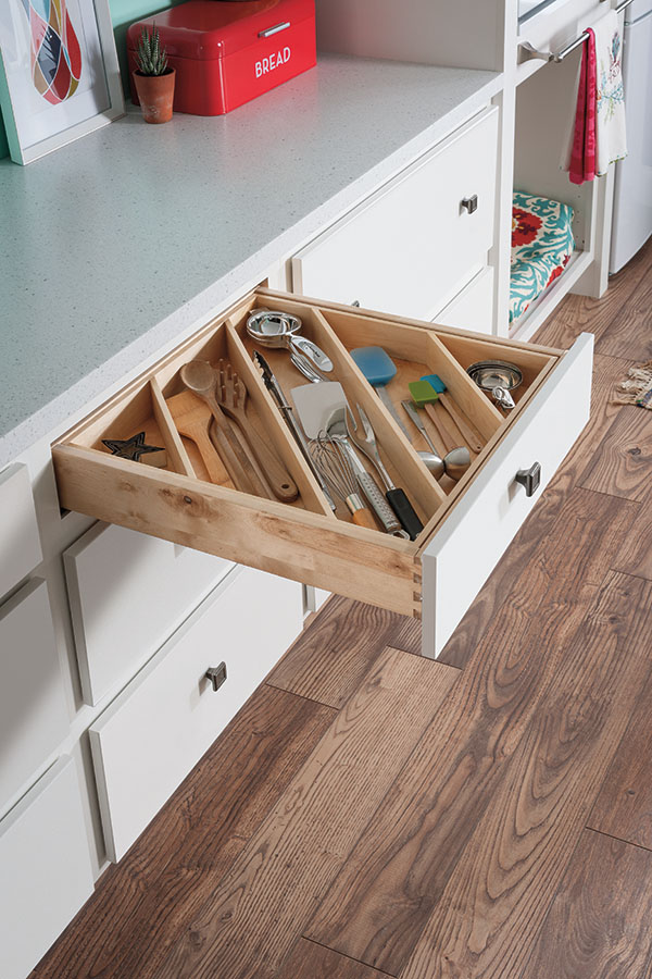 The angled design of the Cooking Utensil Divider perfectly accommodates long handled utensils as well as smaller items you need to keep at hand, transforming even the most cluttered drawer space.