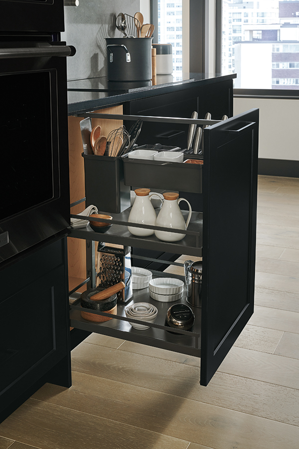 Nouveau's matte charcoal storage solutions contain clutter in style. The Base Storage Pull-out Box Attachment contains several compartments for storage of small items, plus room for larger items on the pull-out shelves.