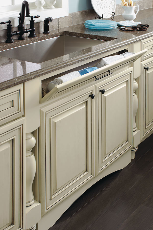 Tilt-out trays provide quick and easy access to commonly used items such as sponges and other cleaning materials.