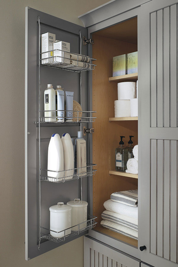 A bathroom must, featuring adjustable shelves that are perfect for storing towels and other linens and a 5" deep chrome door rack offering prime storage space.