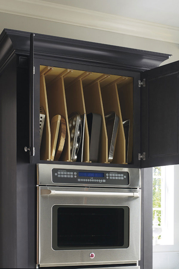 Above the oven is the perfect place to store serving ware, party trays, or bakeware in an organized, easy to access when needed fashion.