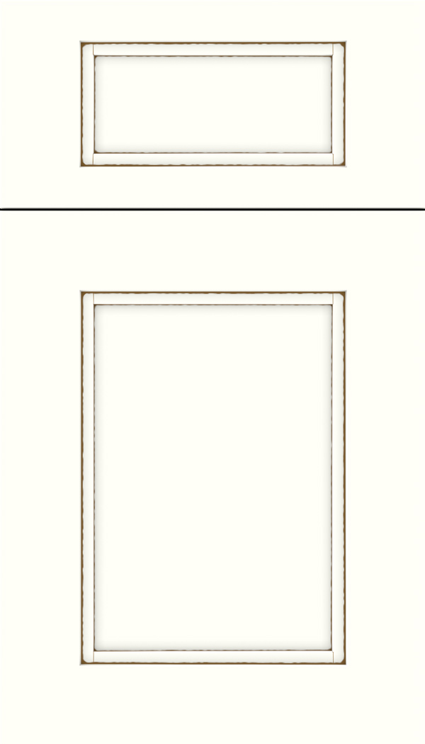 A bright white opaque glazed cabinet finish creating a smooth, clean look, topped with a warm dark gray glaze.