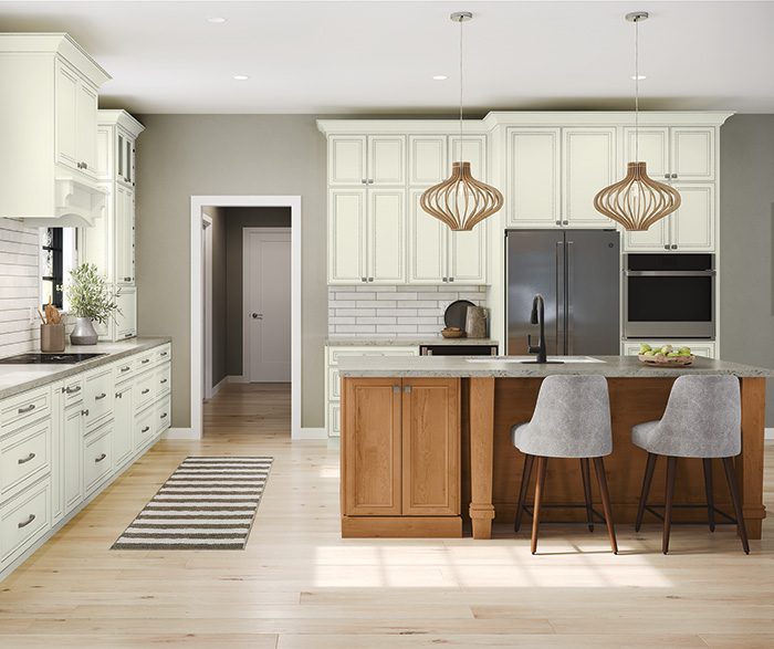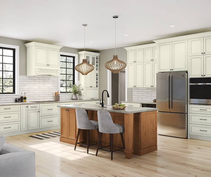 Penned glaze finishes are the perfect solution for highlighting the details of a cabinet door style. Thomasville's Hartley door style features added detail along the profiles, making it a beautiful canvas for a glaze, as this kitchen shows. This L shaped kitchen is completed by a Macaroon finish island, adding an earthy contrast in the space.