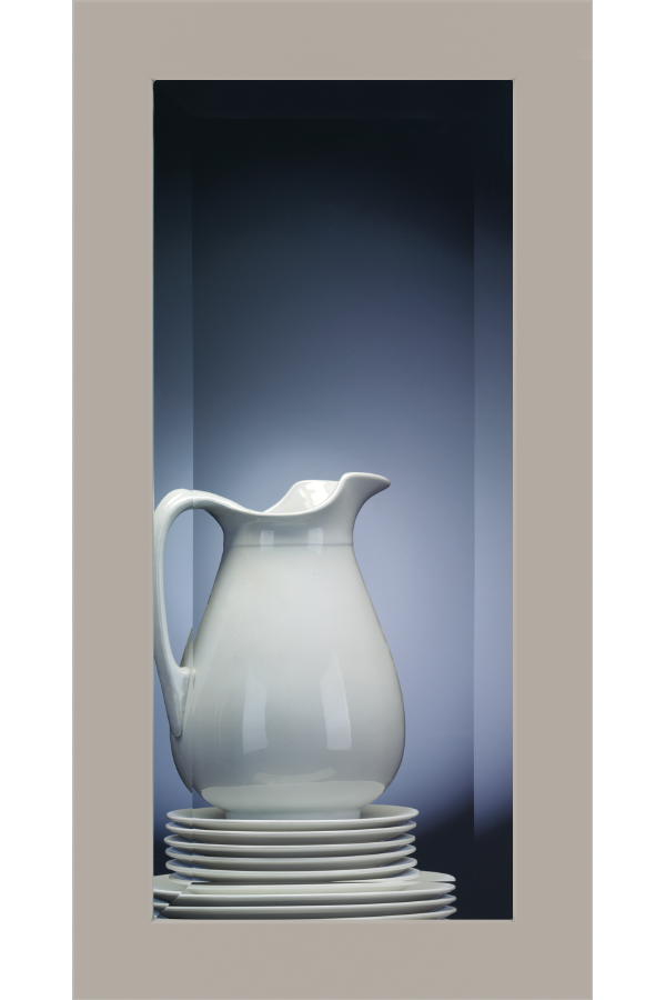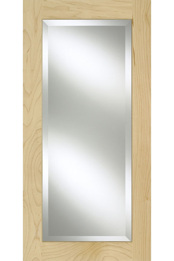 Cabinet contents are fully visible through this clear glass that is set off with a classic beveled edge.